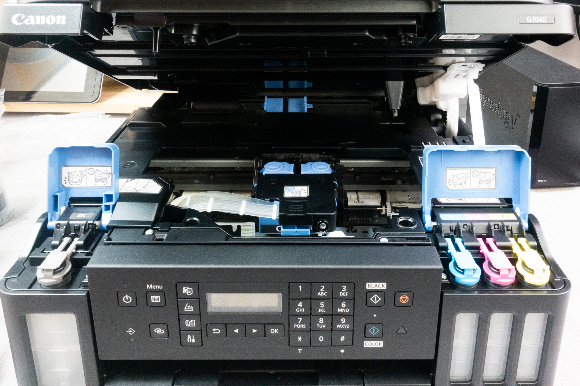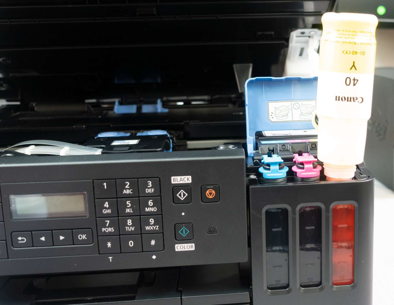Vďaka možnosti dopĺňania atramentov sa rapídne znižujú náklady na tlač, pretože platíte len za atrament a nie za kazety, ktoré obsahujú viac, alebo menej zložitý mechanizmus na dodávanie atramentu do tlačovej hlavy. Šetrí sa životné prostredie, pretože sa nevyhadzujú prázdne kazety entmi. Nakoľko nádržky na atrament sú pomerne veľké, nemusíte ich často dopĺňať, takže sa šetrí aj čas. Priesvitné nádobky za okienkami telesa zásobníkov na tonery umiestneného v prednej časti tlačiarne umožňuje letmým pohľadom skontrolovať hladiny v jednotlivých zásobníkoch. Doplnenie toneru je otázkou niekoľko málo minút. Stačí nadvihnúť horný panel v ktorom je skener a odklopiť kryt uzáverov zásobníkov.