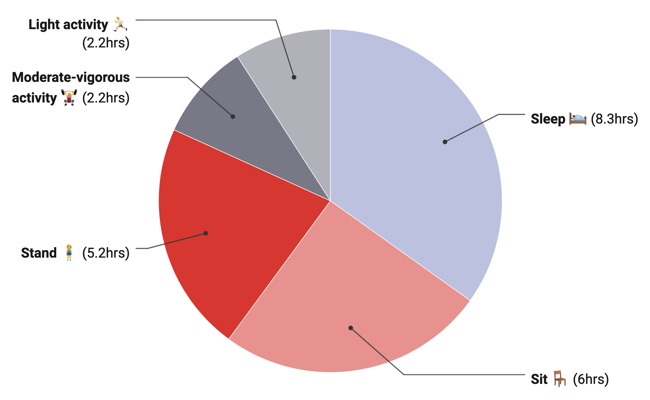 Podľa štúdie, ktorej dáta pochádzajú z The Maastricht Study, by optimálny čas počas 24 hodín mal byť rozdelený nasledovne: 8 hodín a 20 minút spánku, 6 hodín sedenia, 5 hodín a 10 minút státia, 2 hodiny a 10 minút ľahkej fyzickej aktivity a rovnako 2 hodiny a 10 minút stredne intenzívneho až intenzívneho cvičenia. Toto rozdelenie času je podľa štúdie spojené s celkovým optimálnym zdravím a pozitívne ovplyvňuje širokú škálu zdravotných ukazovateľov.