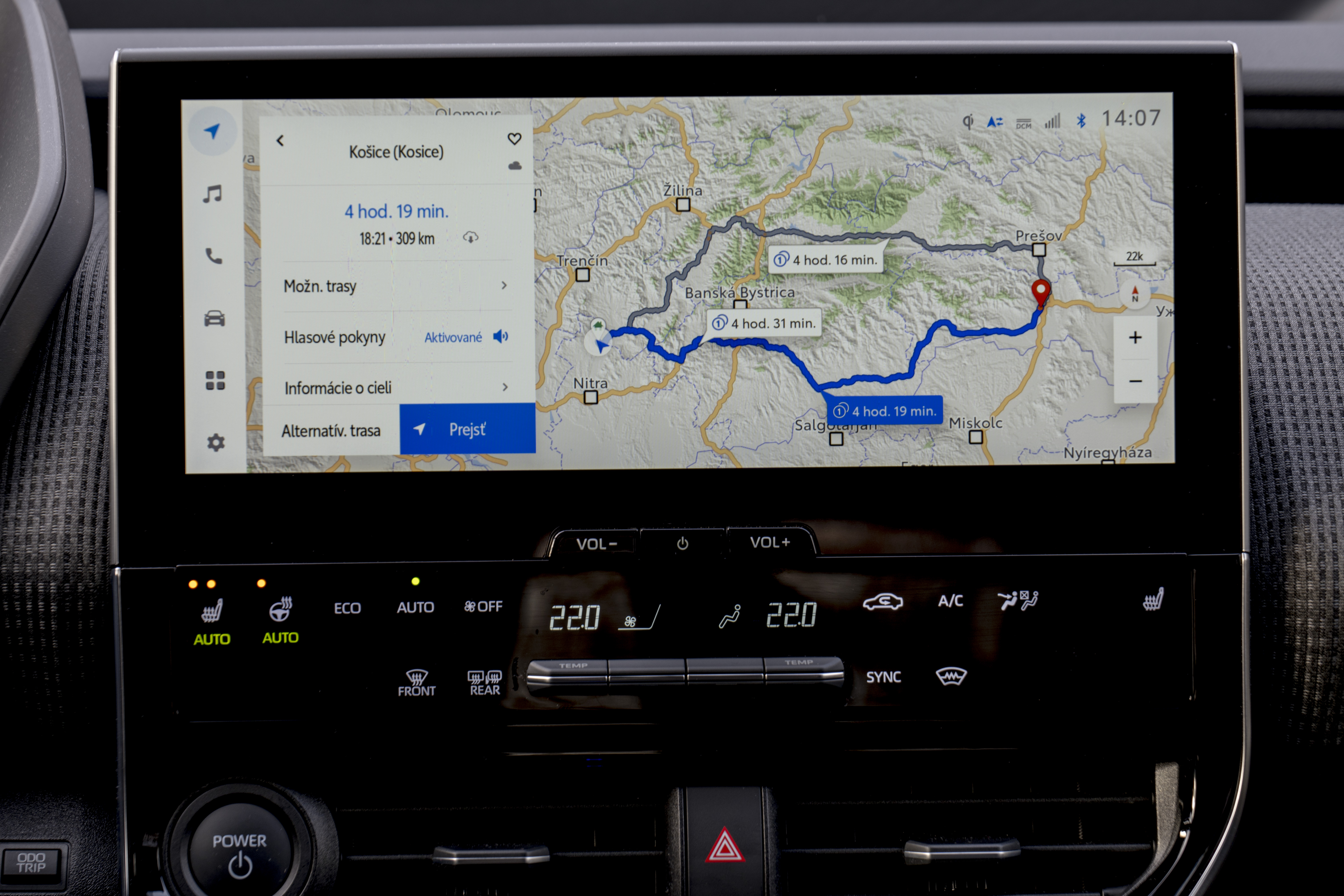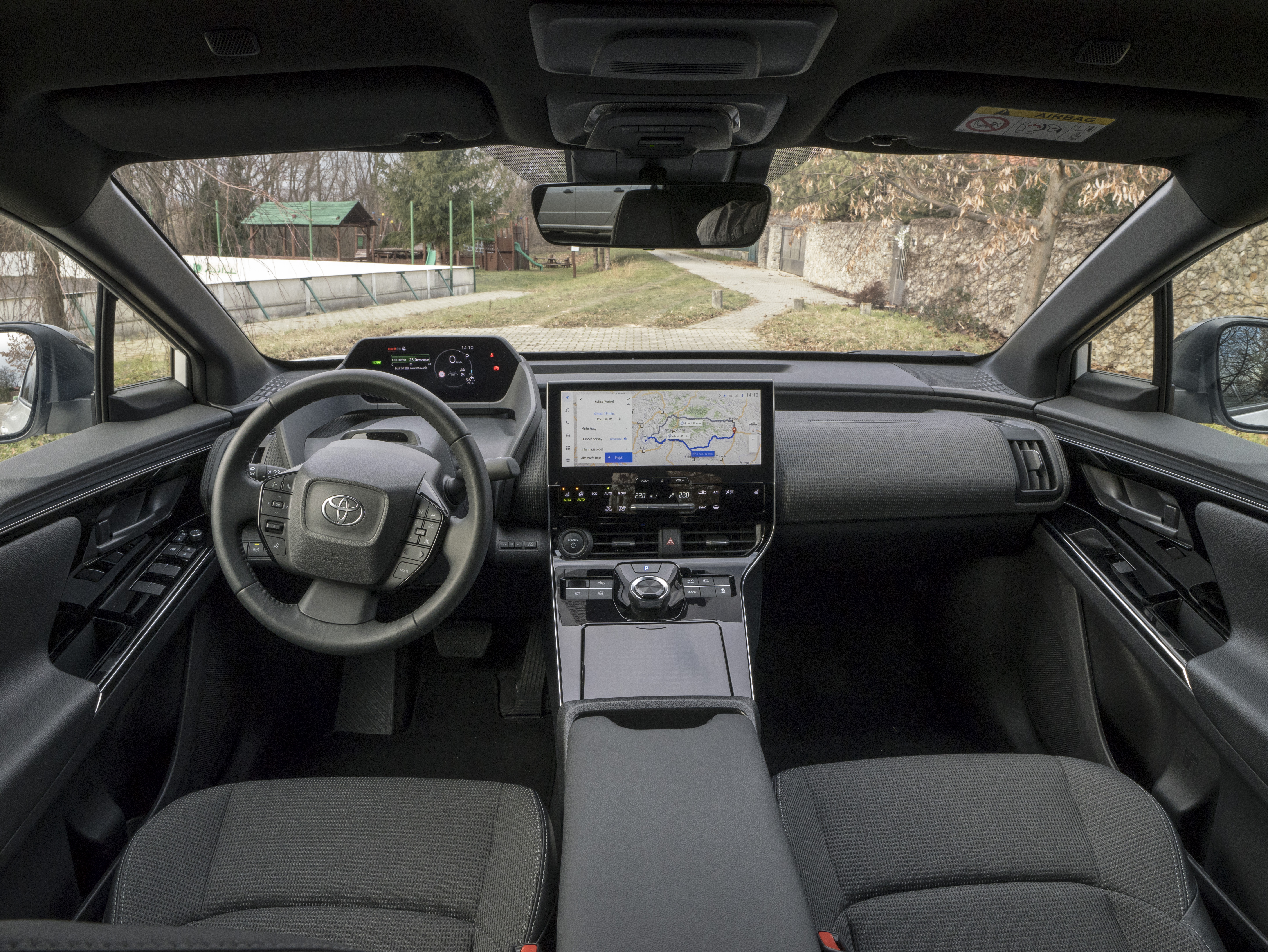 Po nastúpení do vozidla zaujme kvalitné spracovanie interiéru a nezvyčajné riešenie digitálneho prístrojového štítu, na ktorý sa pozeráte ponad volant. Výrobca pôvodne uvažoval o využití špeciálneho zrezaného volantu pripomínajúceho barany v lietadle so systémom steer-by-wire, teda „riadením po drôte“, ktorý mal byť dodávaný na želanie v rámci systému One Motion Grip. No vyzerá to tak, že z tohto zámeru nakoniec zostala práve iba čudná palubná doska. Nastavenie volantu do správnej polohy tak je náročnejšie a vychádzalo nám príliš nízko. Dá sa na to síce zvyknúť, ale radšej by sme prijali klasickejší prístrojový panel v kombinácii s projekčným displejom HUD, ktorý pre tento model výrobca neponúka. Kabína je vcelku priestorná, vpredu však miesto obmedzuje nezmyselne široká stredová konzola. Týmto neduhom dnes trpí viacero moderných áut a pohodlie je, žiaľ, obetované dizajnu. Stredový panel aj s displejom je navyše obrovskou lesklou plochou, na ktorej neustále vidíte prach a odtlačky prstov. Displej je veľký, s vysokým rozlíšením. Pod ním sa nachádza rad dotykových tlačidiel ovládania klimatizácie, hlavné ovládače sú však mechanické, rovnako aj tlačidlá na volante. Volič režimov jazdy je otočný, pred zmenou režimu musíte zatlačiť vonkajšiu obruč a pootočiť. Na rozdiel od mnohých konkurentov si Toyota zachováva väčšinu nastavení na prístrojovom paneli, centrálny displej je vyhradený iba infotainmentu. Trochu sklamaním tu bola navigácia, ktorú automobilka používa vo viacerých nových modeloch. Jej zobrazenie nie je preškálované na vysoké rozlíšenie displeja, takže všetky nápisy a symboly sú veľmi malé a počas jazdy zle čitateľné. Ak vypnete hlasové navádzanie, po zapnutí auta sa vždy zapne, aj vtedy, keď iba pokračujete v trase. Z hľadiska elektromobilu navyše navigácia nemá žiadne funkcie okrem náhľadu dojazdu na mapke, čo je pri takomto modernom aute trocha málo. Android Auto a Apple CarPlay pracujú iba cez kábel. Pokiaľ napríklad Android Auto používate a pri ďalšom zapnutí auta kábel k mobilu nepripojíte, telefón sa nepripojí cez bluetooth napriek tomu, že je spárovaný, tak ako je to pri všetkých iných autách, ale zostane odpojený a vy musíte ísť do menu zariadení a prepnúť prepínače na používanie bluetooth. Dúfame, že túto softvérovú chybu výrobca odstráni.