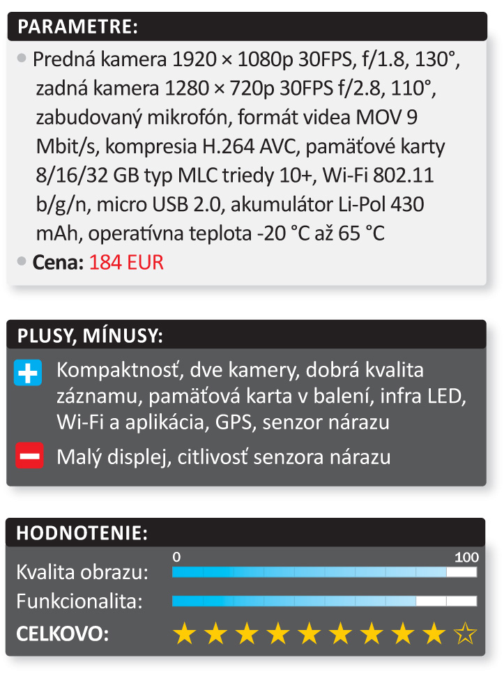 Predná kamera disponuje rozlíšením full HD a kvalita záberov je na dobrej úrovni. Evidenčné čísla blízkych vozidiel sú dobre čitateľné a to je základ. Zadná kamera snímajúca posádku pracuje s rozlíšením 1280 × 720p, ktoré takisto postačuje na čistý obraz. Vďaka nej v prípade potreby vidno aj to, čo sa deje za automobilom a čiastočne aj po jeho bokoch. Objektív na snímanie posádky je obklopený infračervenými LED, ktoré zabezpečujú dobrú viditeľnosť aj za zhoršených svetelných podmienok. Určite to ocenia nielen vodiči taxislužieb. Prístroj sa dodáva s pamäťovou kartou micro SDHC s kapacitou 32 GB. Snímané videá sa ukladajú do dvoch rôznych súborov, ktorých veľkosť možno nastavovať maximálne na 5-minútové snímacie intervaly. Takéto 5-minútové video vo formáte MOV z prednej kamery zaberie 450 MB a zo zadnej 285 MB. Po prekročení kapacity karty sú najstaršie videá štandardne premazávané, no tu nastupuje jedna výhoda. Vďaka zabudovanému senzoru nárazu s nastaviteľnou citlivosťou v prípade nehody prejde prístroj do režimu núdzového nahrávania. Takýto záznam je automaticky chránený proti prepisu, ukladaný do inej zložky a na displeji bliká informácia o núdzovom nahrávaní. Počas testu sa nám zdala citlivosť senzora aj na najnižšom stupni trochu prehnaná a raz sa nám spustilo núdzové nahrávanie aj po nabehnutí do výtlku na ceste. Senzor je vypínateľný, no my si radšej užijeme pár planých poplachov, ako by sme neskôr ľutovali jeho vypnutie.