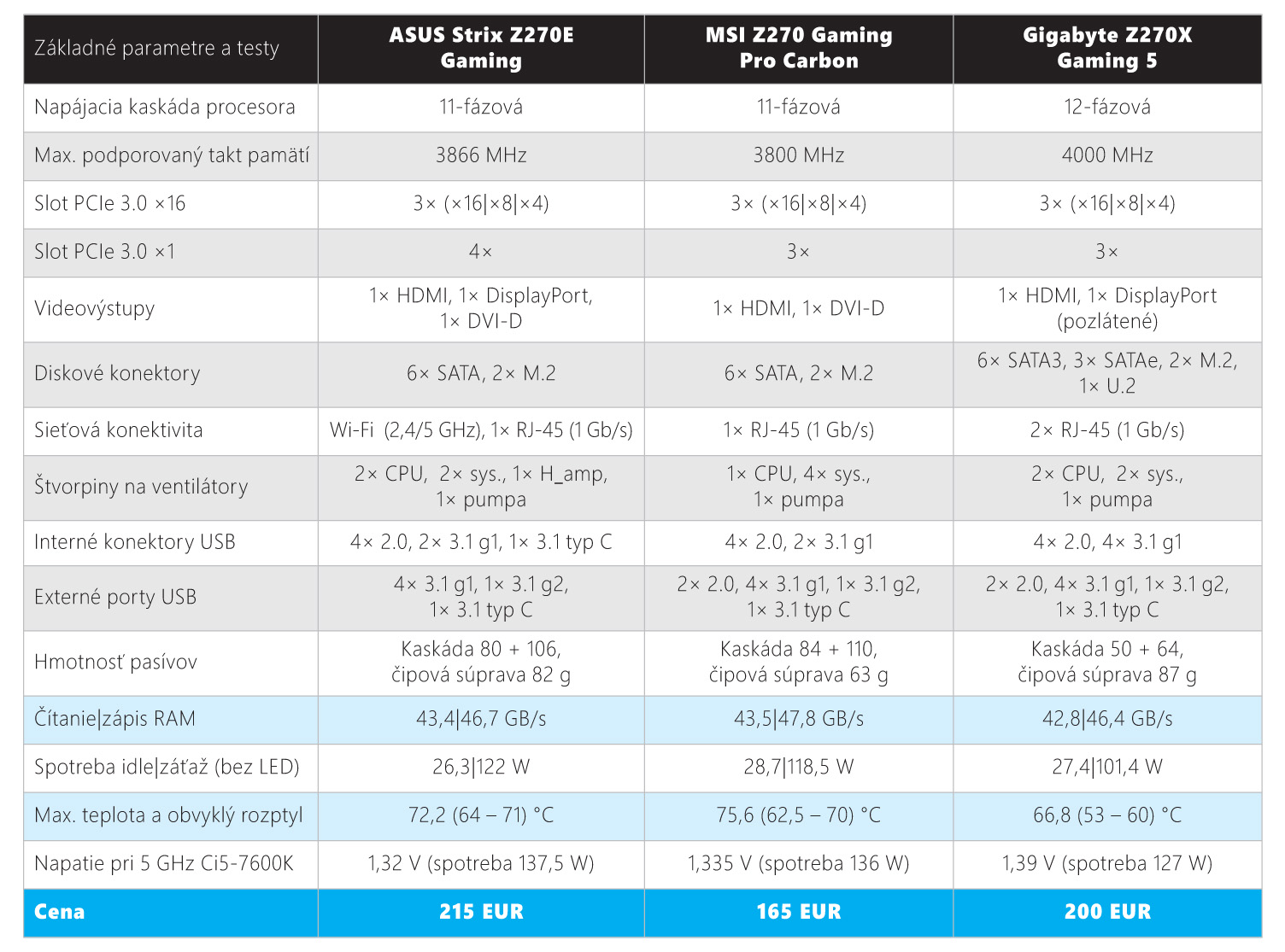 Obsadené sú modely od kľúčových výrobcov na našom trhu s čipovou súpravou Intel Z270, určenou pre náročnejších používateľov, ktorým je umožnené hlavne pretaktovanie procesora bez obmedzení. Oproti starším Z170 majú predovšetkým k PCI Express 3.0 navyše vyvedené 4 linky a oficiálne podporujú SSD Intel Optane. Cenovo sa pohybujeme od 160 do 200 eur, teda v zóne strednej triedy, kde sa zase až tak nešetrí, ale ani neinvestuje do prvkov pre nadšencov, extrémnych overclockerov a podobne.