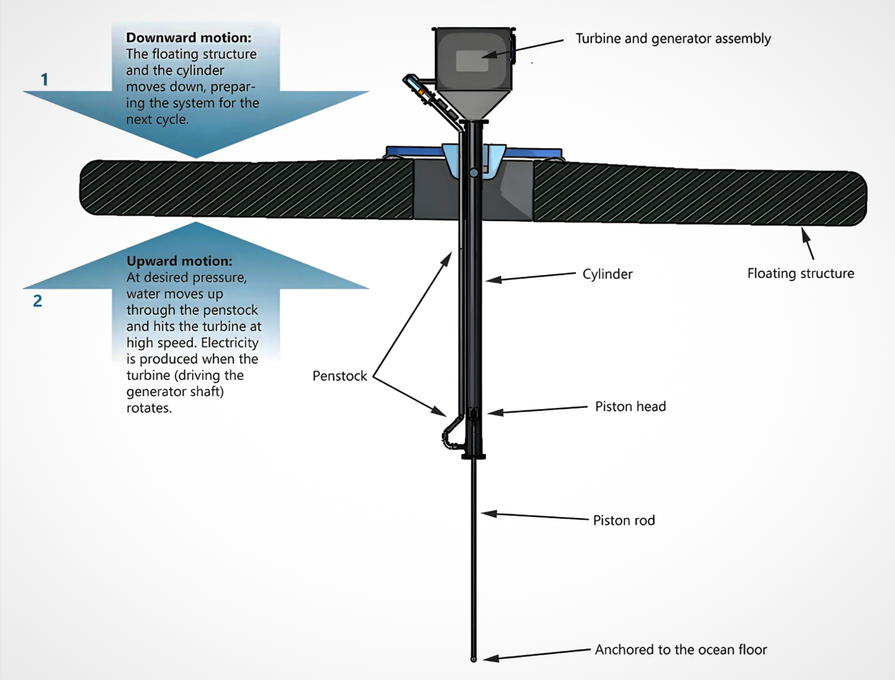 V optimálnom okamihu sa ventil otvorí a vztlak sa uvoľní, čím sa na plaváku vytvorí obrovská vztlaková sila až 600 ton. Táto sila pri stúpaní plaváka vyťahuje vodu cez privádzač a pri vysokých otáčkach ju prepúšťa cez turbínu generátora Peltonovho typu na vrchole, čím sa vytvára až 650 kW okamžitej čistej energie. Podľa spoločnosti NoviOcean na dosiahnutie maximálneho výkonu stačia vlny vysoké 4 metre.