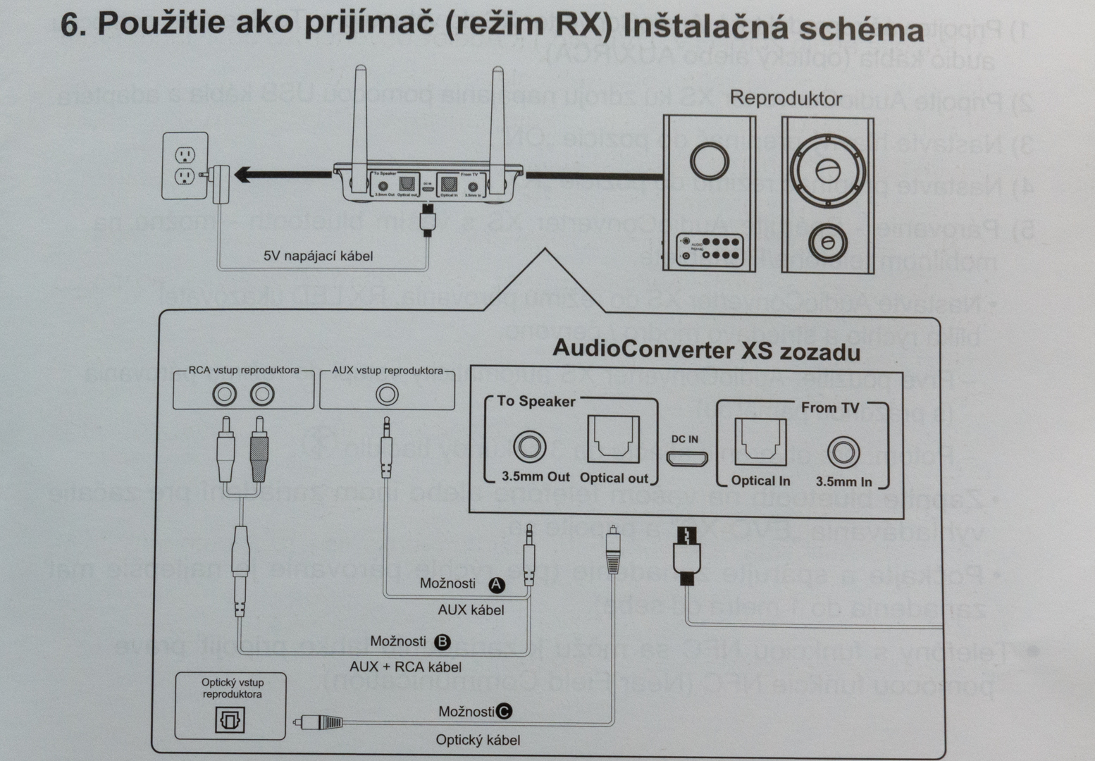 AudioConverter XS vie taktiež prijímať bezdrôtový signál Bluetooth a prevádzať ho na signál vedený optickým alebo analógovým káblom. Takto je možné prepojiť napríklad televízor s domácou HI-FI stereo súpravou, slúchadlami a ďalšími produktmi na reprodukciu zvuku, ako sú prenosné reproduktory alebo soundbary.