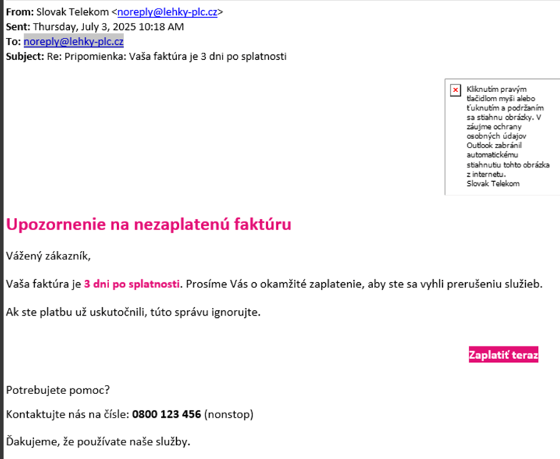 Slovak Telekom žiadny takýto e-mail nezaslal, všetky faktúry a upomienky sú za Slovak Telekom zasielané z e-mailovej adresy faktura@telekom.sk, v ojedinelých prípadoch aj z adresy moj@telekom.sk. Zákazníkom odporúčame, aby si v prípade podozrivých e-mailov dôsledne overovali odosielateľa a predmet správy. V žiadnom prípade neodporúčame otvárať prílohy ani klikať na odkazy v e-mailoch, ktoré nepochádzajú z našej oficiálnej adresy, ani zadávať osobné či platobné údaje.