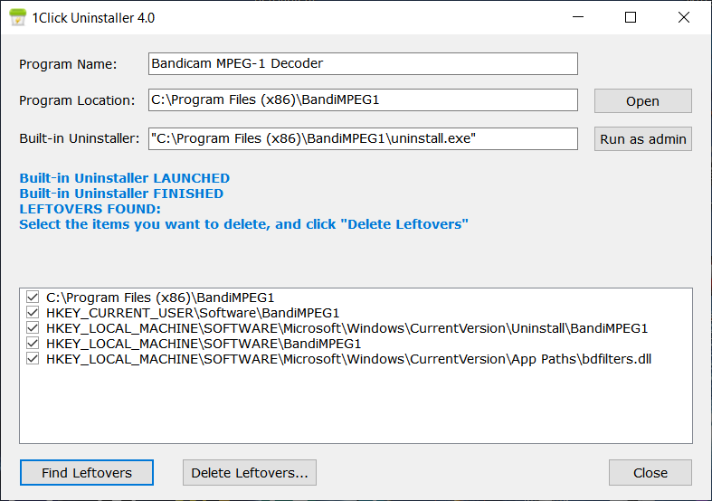 - v prípade funkčného vlastného odinštalátora sa aplikácia odstráni štandardným spôsobom, následne je však ponúknutá možnosť odstrániť aj pozostatky po aplikácii, napr. rôzne podpriečinky na systémovom disku a zápisy v registroch operačného systému