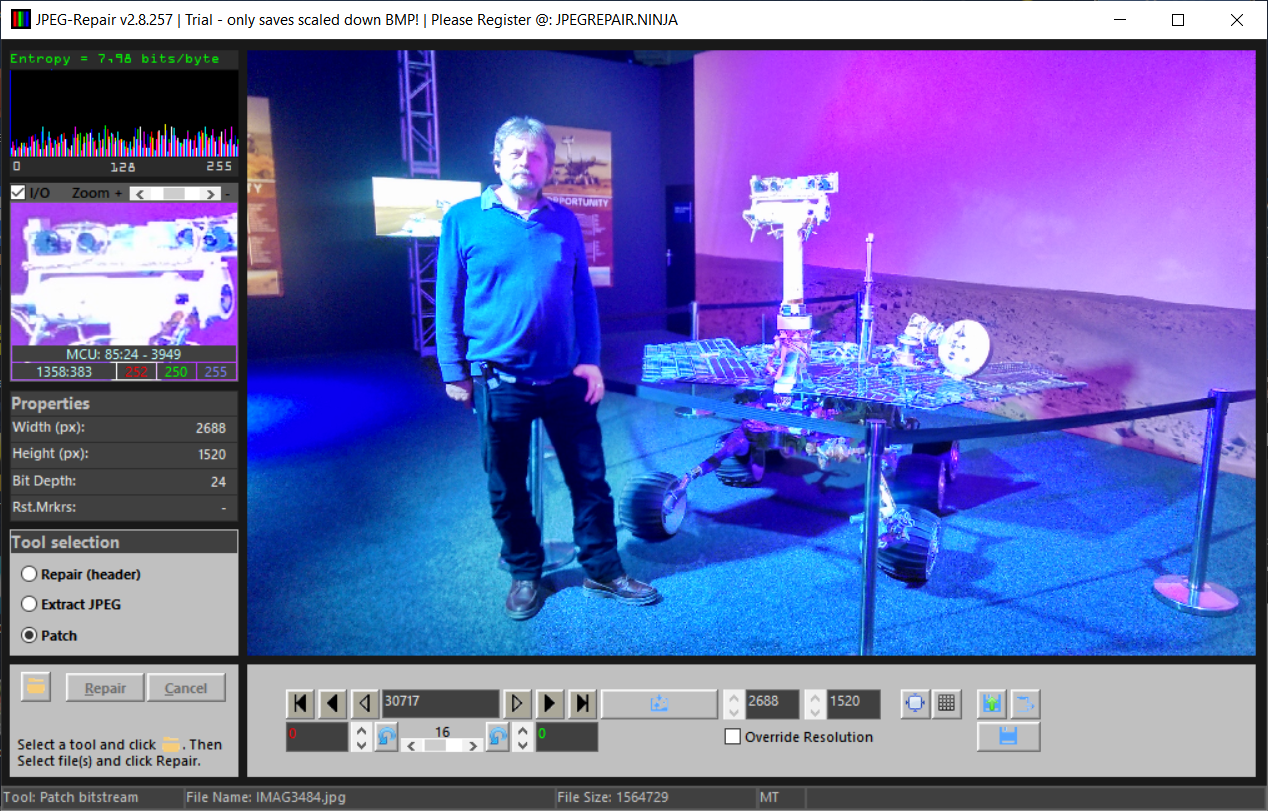 - prvý nástroj dokáže opraviť súbory JPEG s poškodenou hlavičkou a značkami JPEG, napr. z dôvodu poškodených sektorov na diskovom médiu, nedokončeného procesu ukladania na médium alebo po útoku niektorých typov ransomvéru
