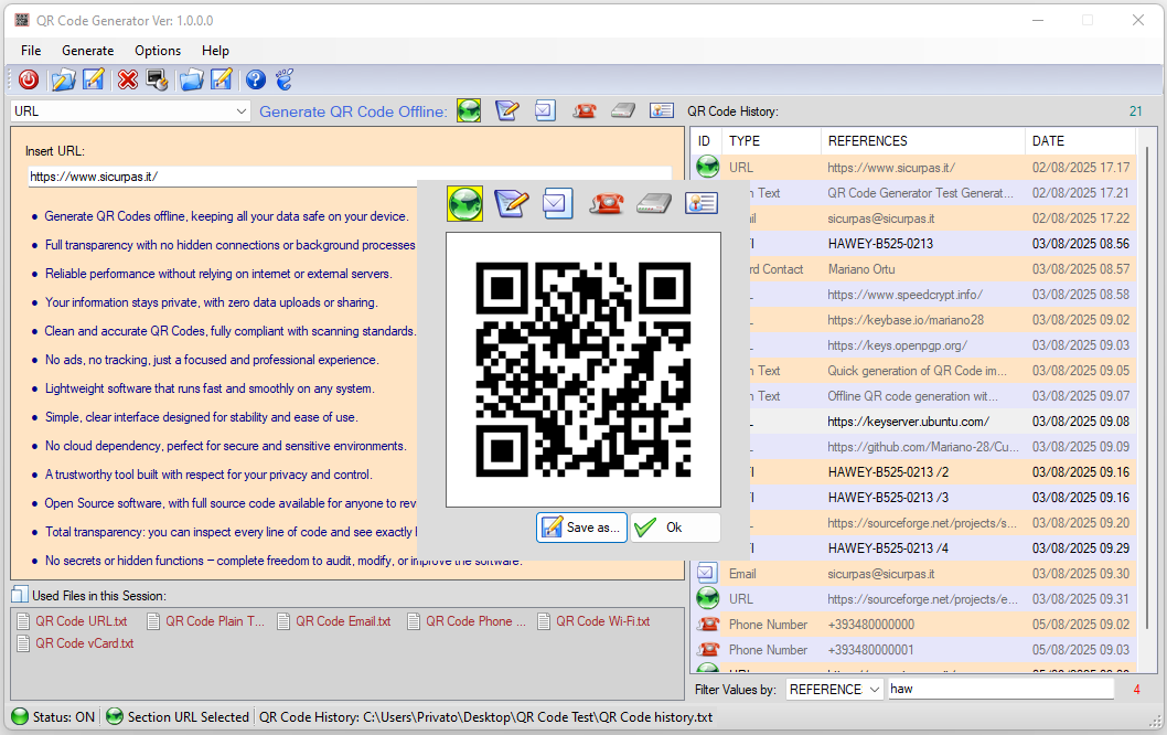 - program si ukladá históriu zdrojových informácií generovaných QR kódov na ich jednoduché opätovné vyvolanie
