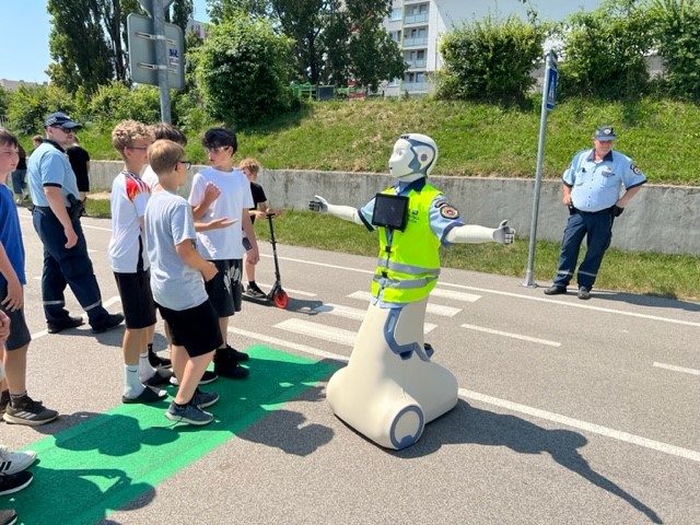 Na dopravnom ihrisku na základnej škole v bratislavskej Karlovej vsi výskumníci z FIIT STU a KIT Karlsruhe v spolupráci s Mestskou políciou Bratislava testovali, ako deti reagujú na humanoidného robota, ktorý má zabezpečiť bezpečný prechod detí cez cestu pred školou.