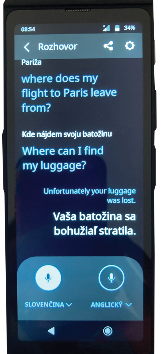 Prekladač Vasco Translator V4 ponúka výdrž batérie až 180 hodín v pohotovostnom režime a 48 hodín aktívneho času používania, takže zariadenie nebudete musieť na dovolenke nabíjať každý deň. Výhodná je aj trieda ochrany IP64, čo v praxi znamená ochranu pri postriekaní vodou alebo pred dažďom a prachom. Pri prvom kontakte so zariadením som premýšľala nad výhodou prekladača oproti aplikácii určenej na prekladanie v mobilnom telefóne. Jednoznačný rozdiel je v redukcii šumu, takže prekladač dokáže správne zachytiť slová aj v hlučnejšom prostredí. Rovnako aj kvalita prekladu, za ktorou stojí zdokonalený algoritmus, je lepšia, než ponúkajú bežne dostupné aplikácie. Počas testovania som preklady porovnávala so známou aplikáciou Google Translate a pri preklade zo slovenčiny do angličtiny a naopak som zaznamenala len veľmi malé rozdiely. Osobne ma oslovil konverzačný mód, v ktorom vidíte históriu konverzácie, pričom prekladanie z jedného jazyka do druhého a naopak je veľmi jednoduché a intuitívne.