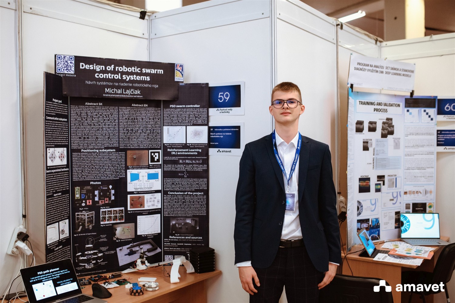 Súťažiť v LA bude v kategórii Robotics and Intelligent Machines (ROBO). Ako charakterizuje svoj projekt Michal? „Môj projekt sa zameriava na vývoj a implementáciu riadiaceho systému pre robotický roj, ktorý dokáže plánovať cesty a prerozdeľovať úlohy v dynamickom prostredí. Vytvoril som architektúru FNN (Feedforward Neural Network) na predpovedanie vhodnosti každého robota pre konkrétne úlohy a hybridný algoritmus RRT-APF na tvorbu ciest agentov roja. Navrhol som vlastný experimentálny hardvér (modulárnych agentov) a riešenie SMART Floor, v ktorom som simuloval a testoval systém a hardvér pre aplikáciu roja na zníženie času a nákladov potrebných na rekonfiguráciu výrobných liniek.