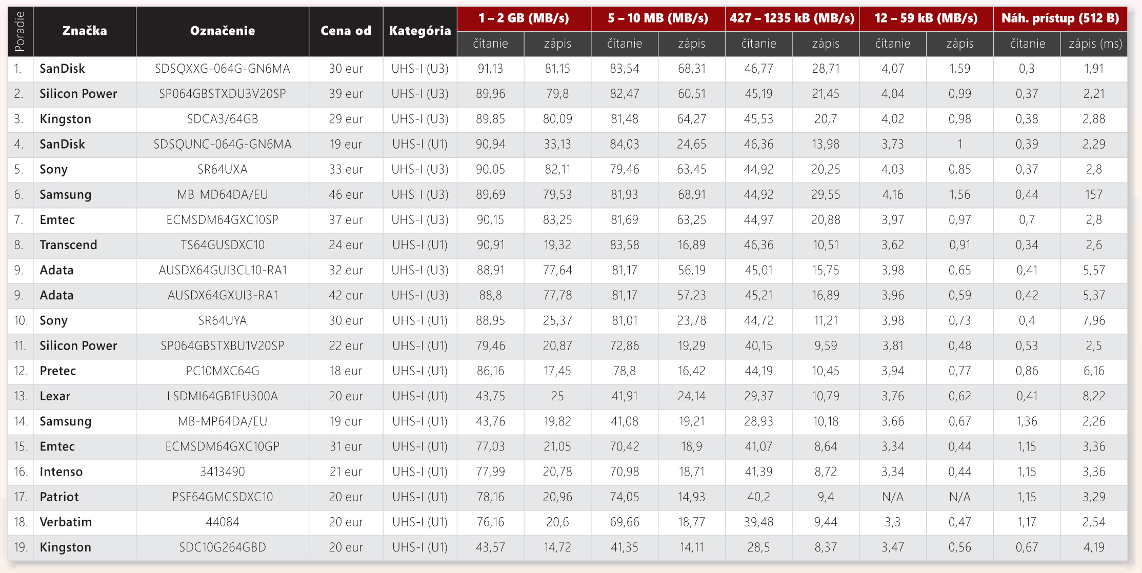 Najhoršie obstál lacnejší z dvojice modelov Kingston, ktorý sa predáva za rovnakú či dokonca vyššiu cenu ako množstvo výkonnejších kariet. V kamenných predajniach určite narazíte na tento model so značkou silného mena, od nás však už viete, že sa príliš neoplatí. Podpriemerné (to je v tomto prípade lichôtka) výsledky podáva iba pri práci s veľmi malými súbormi a úplne tragická nie je ani prístupová doba. Ak hľadáte lacnú kartu, ale s podmienkou rýchleho čítania, naskytajú sa hneď tri možnosti – svoje želiezko v ohni má Verbatim, Patriot aj Intenso. Testované modely týchto značiek sú si veľmi podobné, ibaže Patriot je trochu pomalší v zapisovaní fotiek a úplne zlyháva (po prenesení zhruba 37 MB prepad na 10 kB/s) pri zápise najmenších súborov. Verbatim má z tejto trojice zase najsvižnejšiu prístupovú dobu. Intenso sa podobá jednej z kariet Emtec ako cez kopírku. V neprospech Emtecu však hrá podstatne vyššia, veľmi nevýhodná cena. Miniduel Lexaru a Samsungu Evo, teda modelov s nízkou rýchlosťou čítania, ale rýchlejším zápisom než pri kartách na 18. – 16. mieste, vyhráva tesne Lexar, ktorý zvýhodňuje najmä rýchle čítanie náhodných 512-bajtových blokov (opačným smerom, teda zápisom je však na chvoste).