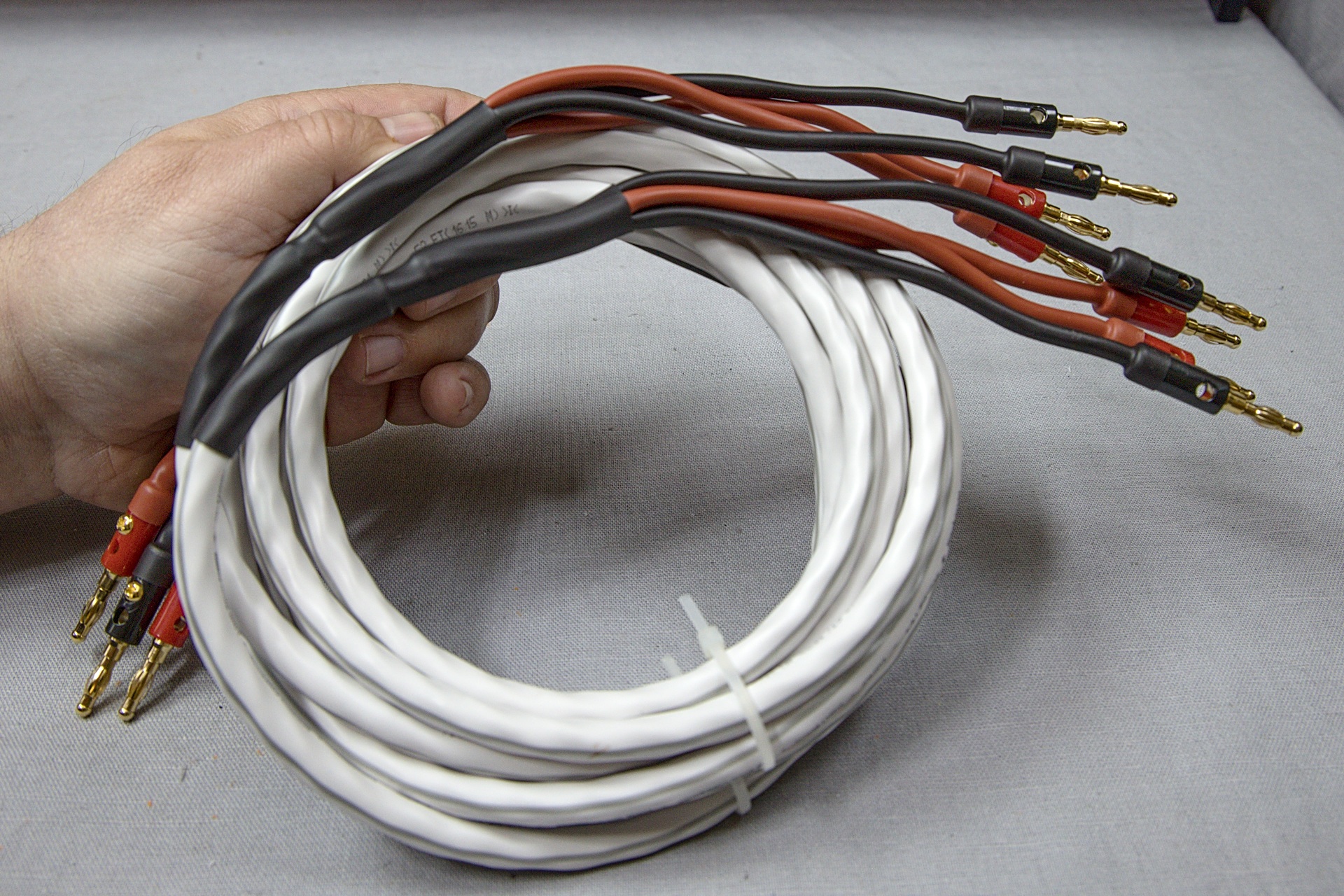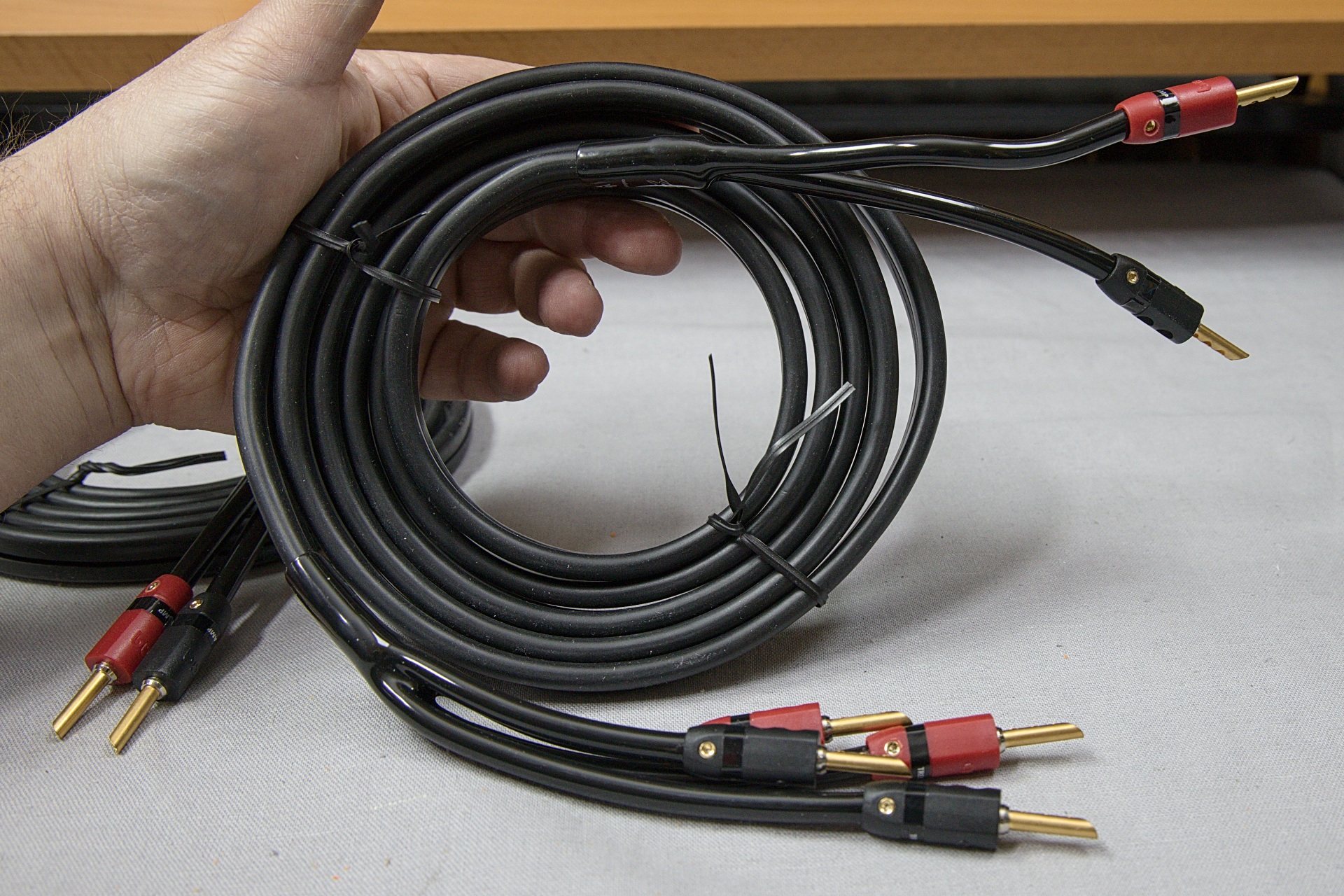 Obidve súpravy káblov sú určené pre zapojenie typu bi-wire. Pri takomto zapojení majú reproduktorové sústavy dva páry svoriek, jedny sú pripojené k výhybke pre basový reproduktor a druhé k výškovému a strednotónovému reproduktoru. Reproduktorová sústava je k výkonovému zosilňovaču pripojená dvomi pármi káblov, ktoré sú prepojené v blízkosti svoriek na výkonovom zosilňovači. Prečo je to tak? V prípade ak sú tieto dve signálové vetvy prepojené až na svorkách zosilňovača, prinútime parazitný signál od cievky basového reproduktora, aby v prípade dvojmetrových káblov musel prekonať vzdialenosť až 4 metre a hlavne, že „na pol ceste“, teda na svorkách zosilňovača je signál skratovaný pomerne nízkou impedanciou výstupu zosilňovača. Takže takýmto jednoduchým spôsobom, dokážete v mnohých prípadoch poznateľne zlepšiť kvalitu reprodukovaného zvuku. Samozrejme iba v prípade ak vaša reproduktorová sústava takéto pripojenie umožňuje, čiže má dva páry svoriek. Viac o bi-wire zapojení sa dočítate v tomto článku a vo videu