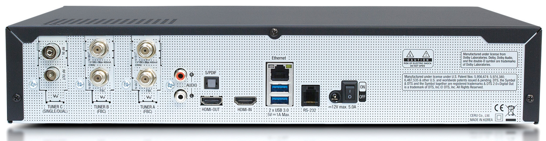 Zámerne nehovoríme o satelitnom prijímači, pretože tak ako predchodca okrem satelitného príjmu v normách DVB-S a DVB-S2 umožní aj príjem káblového vysielania v norme DVB-C a terestriálneho v DVB-T/T2 podľa aktuálnej konfigurácie. Prijímač je schopný spracúvať signály v rozlíšeniach SD, HD aj UHD a kompresiami MPEG-2, MPEG-4/H.264 a HEVC/H.265. Obsahuje dovedna tri sloty na osadenie tunerov, z toho dva typu FBC a jeden klasický pre staršie typy tunerov. V základnej konfigurácii je osadený duálnym FBC tunerom DVB-S/S2. Ten sa v skutočnosti správa ako 8 virtuálnych tunerov, takže v základnej konfigurácii dokážete súčasne nahrávať kanály až z 8 transpondérov, pri použití ďalšieho FBC tunera sa ich počet rozšíri na 16. Tým sa však možnosti nekončia. Ďalší tuner staršieho typu môže pridať ďalšie dva transpondéry, a keby to bolo málo, cez USB môžete pripojiť ďalší externý tuner DVB-T. Obmedzením, samozrejme, bude celkový dátový tok. Zatiaľ čo súčasné nahrávanie toľkých kanálov asi málokto využije, táto vlastnosť sa dá s výhodou použiť na streamovanie v rámci domácnosti. Namiesto toho, aby ste museli po celom dome naťahovať satelitné káble, pripojíte ďalšie prijímače VU+ alebo PC iba k LAN a môžete bez väčších obmedzení sledovať vysielanie nezávisle od toho, čo sa sleduje na zdrojovom prijímači. Pochopiteľne, na takéto použitie treba mať nakonfigurovaný aj anténny systém. Použiť môžete aj sledovanie TV cez mobilnú aplikáciu Vu+ PlayerHD, ktorá umožní okrem sledovania živého vysielania sledovať aj nahrávky z interného pevného disku.