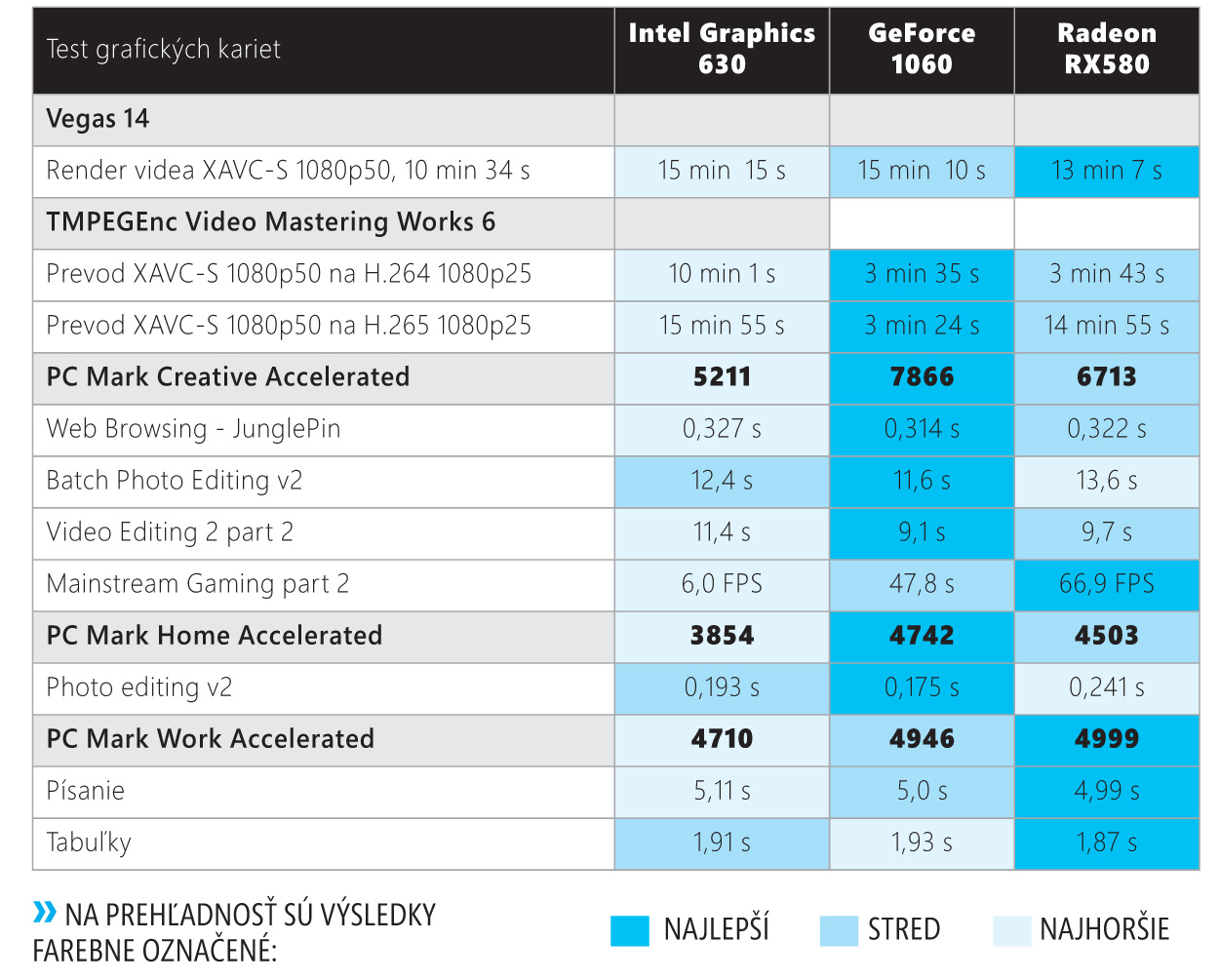 Testy pomocou PC Mark 8 Professional Edition umožňujú zobrazenie výkonu zostavy v typických scenároch použitia. Test Home Accelerated postupne meria výkon pri surfovaní v internetovom prehliadači, písaní, editovaní fotiek, videočete a príležitostnom hraní. Creative accelerated testuje surfovanie po webe, skupinový videočet, editovanie fotiek vrátane dávkového, editovanie videa, typické hranie hier, kódovanie videa a hudby. Work accelerated testuje surfovanie po webe, písanie, spracovanie tabuliek a videočetovanie. V prilo- ženej tabuľke môžete vidieť celkové hodnotenie z jednotlivých testov aj s vybranými čiastkovými výsledkami. Aj z tabuľky jasne vidieť, že najväčší prínos dedikovaných grafických kariet je pri spracovaní videa. Pri výbere konkrétnej grafickej karty však treba brať ohľad hlavne na technológie, ktoré podporuje. Na hardvérové spracovanie videa sa využívajú Open CL a CUDA. Open CL je otvorená platforma a používajú ju grafické karty AMD aj NVIDIA, aj keď v tomto prípade je aplikácia v kartách AMD lepšia. NVIDIA má svoju platformu CUDA. Tá je špecializovaná na kódovanie videa, ale vzhľadom na to, že ide o licencovanú platformu, jej podpora zo strany softvéru je menšia. Keď sa pozrieme do tabuľky, vidieť to hneď na začiatku pri praktických testoch videa. Program Vegas 14 podporuje iba hardvérovú akceleráciu Open CL. Testoval som rendering projektu s rozlíšením 1080p50 s dĺžkou 10 min 34 s do kodeku XAVC-S. V tomto prípade si prvenstvo odniesla karta AMD Radeon RX580, ktorá natívne podporuje Open CL, rozdiel oproti nVidii aj grafike Intel je pri renderingu okolo dvoch minút. Pri práci s programom je použitie oboch dedikovaných kariet oproti integrovanej výhodné aj pri prehrávaní z časovej osi. Obe karty umožňujú viac-menej plynulé prehrávanie z časovej osi aj v rozlíšení 4K50p. S integrovanou grafikou pri 4K rozlíšení dochádza k trhaniu obrazu. Rovnako je to aj pri prehrávaní 4K videa v prehrávači VLC. Ten s integrovanou kartou prehráva plynule súbory v distribučných formátoch v H.264 aj H.265. Súbory s videokamier v 4K50p s vysokými dátovými tokmi však prehráva trhane. Najväčší rozdiel nastane pri použití programu TMPEGEnc Video Mastering Works 6. Ide o profesionálny nástroj na kódovanie videa v rôznych formátoch. Pri použití karty NVIDIA využíva technológiu CUDA s enkodérom NVENC. Tu veľmi dobre vidieť, aký prínos má hardvérové kódovanie. Komprimovali sme video vo formáte XAVC-S 1080p50 do MKV H.264 1080p25 a MKV H.265/HEVC 1080p25. S integrovanou grafikou prebieha kódovanie iba softvérovo a vidieť to aj na výslednom čase 10 min 01 s, respektíve 15 min 55 s. Pri použití hardvérového kódovania sa časy dramaticky skrátili na tretinu, respektíve takmer štvrtinu pri H.265. Zaujímavá je v tomto smere karta Radeon. V tejto aplikácii možno využiť AMD Media SDK encoder. Ten dokázal video do H.264 prekódovať iba o 12 sekúnd pomalšie ako NVIDIA. Takže vidieť, že výkonový potenciál by tu bol. Žiaľ, tento enkodér podporuje maximálne rozlíšenie 1080p50 a kodek H.264, takže do H.265 ani do 4K kódovať nevie. Uvidíme, či v ďalších verziách výrobca túto podporu dotiahne. Pri pohľade na ostatné výsledky NVIDIA vedie, rozdiely tu však nie sú priepastné. Jediný skok vidieť pri čiastkových výsledkoch v hraní hier (mainstream Gaming), v ktorom má navrch Radeon, to sa však v tomto prípade dalo čakať. Pri nVidii nejde o najvyššiu verziu.