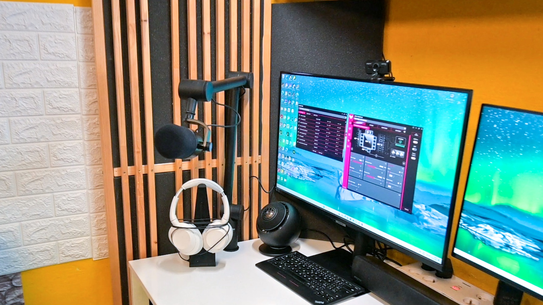 Zriadil som si pracovný kútik v rohu obývačky, pričom na stole pred sebou mám dva 32 palcové monitory tesne vedľa seba. Zvuk, ktorý som v takomto prostredí pomocou kvalitného mikrofónu nahral bol veľmi nekvalitný, pričom hlavným problémom bol dozvuk. Umiestnením panelu s akustickým molitanom v tvare ihlanov na stenu nepomohlo, molitan bol za panelmi monitorov. Dosť pomohlo umiestnenie takzvanej basovej pasce v tvare trojbokého hranolu z akustického molitanu a difúzora na bočnej stene vyrobeného z nerovnomerne rozmiestnených tenkých hranolčekov pod ktorými je molitan. Zvuk bol podstatne lepší, ale stále som s ním nebol spokojný. Možnosti dostupných akustických úprav som v podstate vyčerpal, takže do hry vstúpil softvér, konkrétne NVIDIA Broadcast.