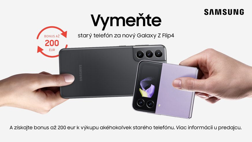 Už len do konca roka platí výhodná bonusová akcia Samsung, v rámci ktorej môžu zákazníci pri výmene starého telefónu akejkoľvek značky za nový Samsung získať extra bonus až do výšky 300 €. Akcia sa vzťahuje vlajkové smartfóny zo série Galaxy S22, S22+ a S22 Ultra, resp. atraktívne skladacie smartfóny s ohybným displejom Galaxy Z Fold4 a Z Flip4. Pri osobnej návšteve značkových predajní Samsung v Bratislave, B. Bystrici, Košiciach alebo Žiline navyše svoj starý smartfón vymeníte za nový jednoducho a bez čakania.