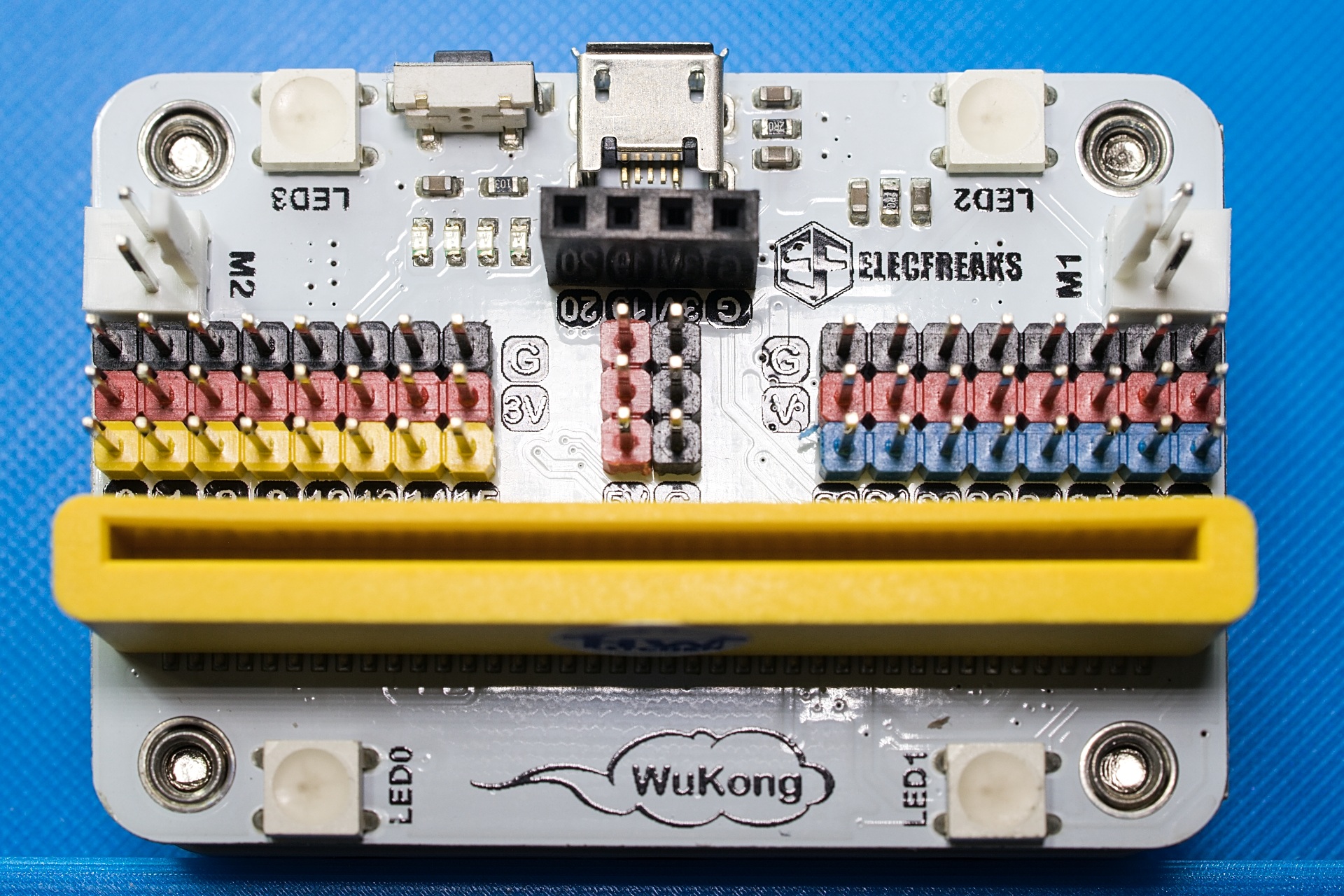 Wukong dokáže ovládať dva jednosmerné motory a osem servomotorov. Môžete taktiež použiť rôzne senzory s možnosťou pripojenia cez GVS, čiže rozhraním využívajúcim tri vodiče: G – elektrická zem, V – napájacie napätie 3.3 V a S – vstupný, alebo signál z portu mikropočítača. K dispozícii je aj rozhranie I2C napríklad na pripojenie OLED displeja. Priamo na doske rozširujúceho modulu sú štyri RGB LED diódy na vytváranie farebných efektov, prípadne na signalizáciu aktuálneho stavu, 8 modrých LED na vytvorenie efektného podsvietenia a taktiež bzučiak na zvukové efekty napríklad trúbenie.