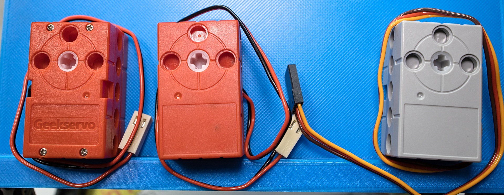 Jednosmerné motorčeky slúžia na pohon kolies robotických podvozkov, servomotory zas umožňujú pootočenie o určitý uhol, čo sa dá použiť na pohyb mechanických dielov, napríklad čeľustí robotickej ruky a podobne. Servomotory sú k modulu Wukong pripojené pomocou troch vodičov. Na červenom vodiči je kladné napájacie napätie, na čiernom (niekedy hnedom) vodiči je zem a na oranžový vodič sa privádza PWM signál. Uhol natočenia sa ovláda šírkou impulzu, ale vy budete používať funkcie z podpornej knižnice pre Wukong, takže budete zadávať priamo uhol natočenia, alebo rýchlosť otáčania kontinuálneho serva.
