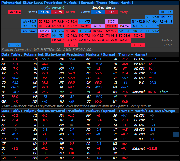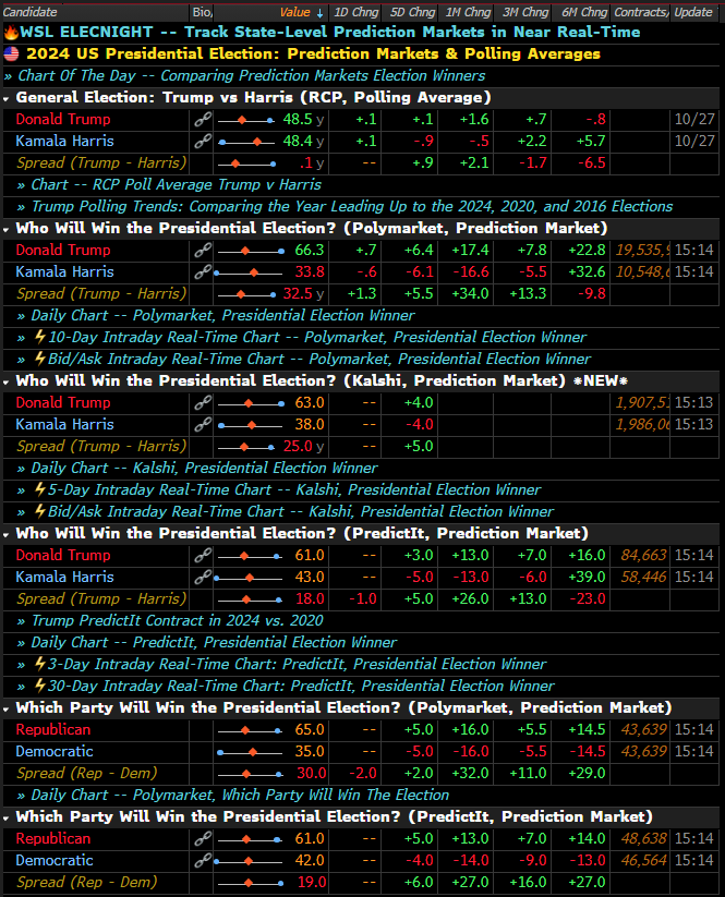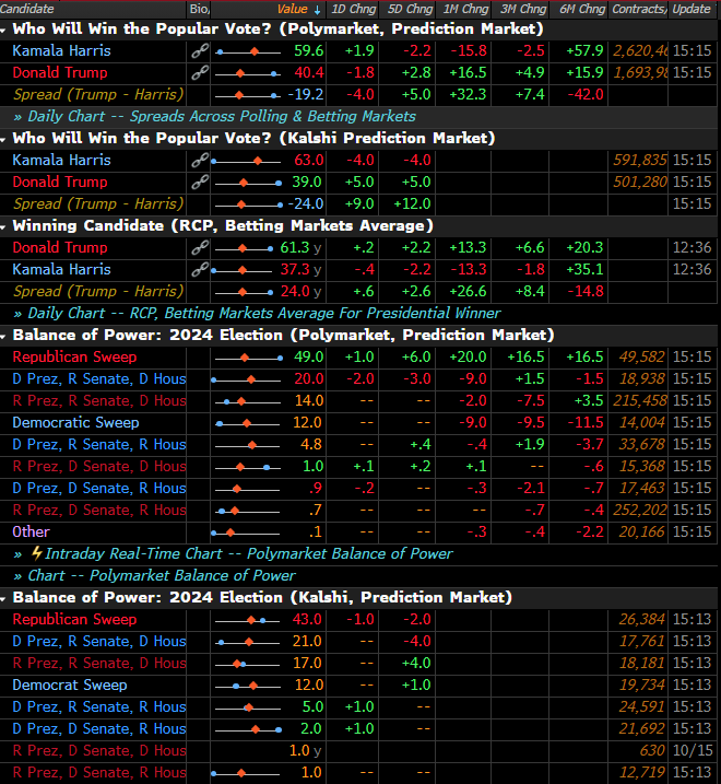 Hoci aktuálne prieskumy naznačujú miernu prevahu Harrisovej, náskok zostáva v rámci chybovosti, čo podčiarkuje neistotu, ktorá je pre tento súboj typická. Pozorovatelia a finančné trhy si uvedomujú obmedzenie tradičných prieskumov verejnej mienky, a preto sa čoraz častejšie obracajú k alternatívnym ukazovateľom, ako sú stávkové trhy, aby odhadli možný výsledok. Logika tohto prístupu spočíva v tom, že jednotlivci s menšou pravdepodobnosťou stavia peniaze na kandidáta, u ktorého neveria, že vyhrá, a preto sú tieto trhy potenciálne spoľahlivejším barometrom nálad. Napríklad počet kontraktov obchodovaných na platformách, ako je Polymarket, sa vyšplhal nad 50 000, čím prekonal veľkosť vzorky mnohých tradičných prieskumov verejnej mienky.