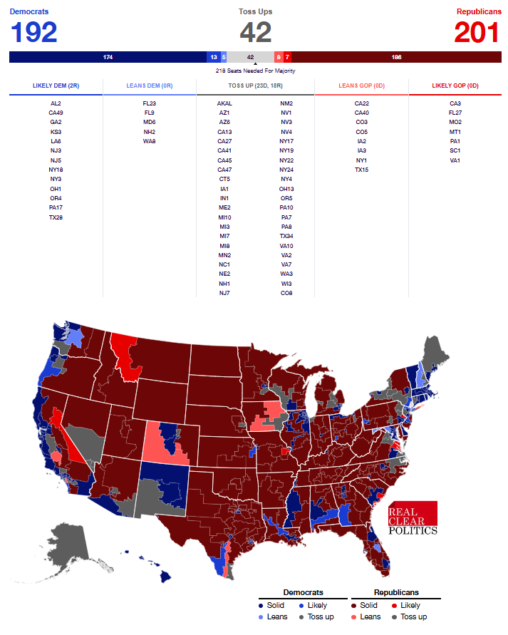 Aktuálne prieskumy verejnej mienky pre voľby do Snemovne reprezentantov naznačujú tesný výsledok. Republikáni potrebujú získať len 11 kresiel, aby si zaistili väčšinu, čo robí súboj obzvlášť napínavým.