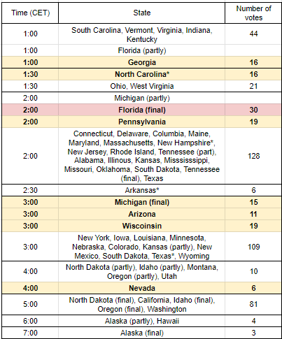 Uvedené časy sú približné a vychádzajú z historických údajov a oficiálnych časov ukončenia hlasovania. Vzhľadom na zložitý volebný systém môže sčítanie hlasov pokračovať ešte mnoho hodín po uzatvorení volebných miestností. Ako príklad môže poslúžiť Georgia, kde bolo Bidenovo víťazstvo nedávno spochybnené. V tomto štáte však boli urobené zmeny volebného systému, ktoré majú pravdepodobnosť takých nezrovnalostí znížiť.