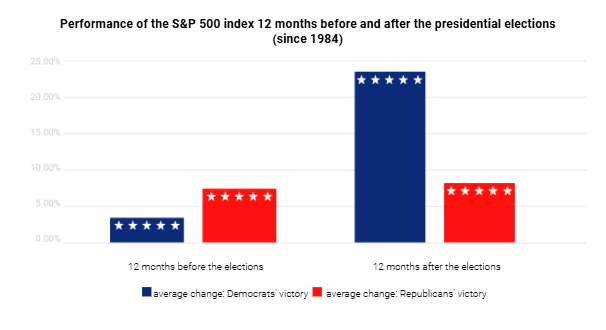 Výkonnosť indexu S&P 500 pred prezidentskými voľbami a po nich podľa strán. Zdroj: Bloomberg Finance LP, XTB