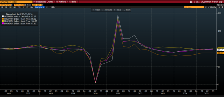 Graf 1: HDP Spojeného kráľovstva, Francúzska, Nemecka a eurozóny od roku 2016, normalizované, aby bolo vidieť, ako sa pohybujú spoločne.