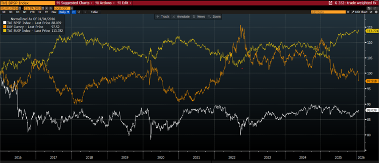 Menový pár GBP/USD sa od hlasovania o Brexite nedokázal dostať nad úroveň 1,50 USD. V období rokov 2010-2016 bol priemerný kurz GBP/USD 1,5770 USD, zatiaľ čo po roku 2016 sa priemerný kurz GBP/USD pohyboval tesne pod úrovňou 1,30 USD. Slabý výkon libry nemožno pripisovať výlučne Brexitu: svoju úlohu zohrali aj pandémia Covid-19 a tzv. minirozpočet (bývalej premiérky) Liz Trussovej. Úpadok amerického dolára v posledných mesiacoch však zvyšuje nádeje, že silná libra by sa mohla opäť stať realitou, keď sa svet posúva ďalej od Brexitu a snaží sa zorientovať v zmenenom globálnom hospodárskom poriadku po inaugurácii prezidenta Trumpa v USA.