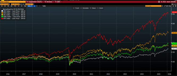 Výkonnosť indexu FTSE 100 od roku 2016 zaostávala za jeho európskymi konkurentmi, ako je vidieť na grafe nižšie. To naznačuje, že Brexit a neistota okolo Spojeného kráľovstva spolu s oslabením libry viedli k odlivu kapitálu z krajiny. Ako je zrejmé z grafu 3 nižšie, presun kapitálu z britských akcií smeroval najmä do USA. Za posledných desať rokov index FTSE 100 výrazne nezaostal za francúzskym CAC alebo indexom Eurostoxx 50. Silnejším hráčom bol nemecký DAX, avšak uplynulá dekáda sa niesla v znamení výraznej nadvýkonnosti amerických akcií, najmä od roku 2020.
