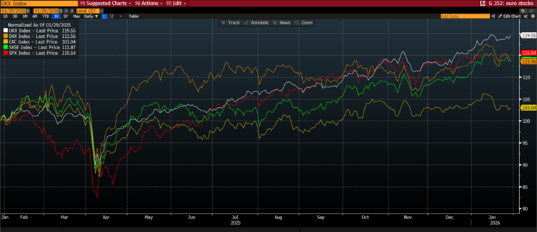 Graf 4: FTSE 100, CAC, DAX, Eurostoxx 50 a S&P 500, normalizované, aby bolo vidieť ich spoločný pohyb za posledných 12 mesiacov.