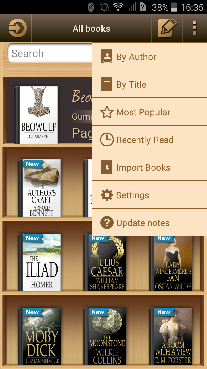 Aplikácia používa relatívne tradičný dizajn vlastnej knižnice, resp. knižnej poličky, na ktorú si možno pridávať jednotlivé tituly. Nechýba tu synchronizácia s ďalšími zariadeniami a podpora súborov PDF, takže si pokojne môžete na svoju poličku pridať z pamäte telefónu či karty SD akékoľvek texty, napríklad aj študijné materiály. Aplikácia natívne podporuje web ebooks.com, z ktorého si možno po založení účtu pridávať do zbierky ďalšie knihy. Okrem toho už po prvom spustení na svojej poličke nájdete niekoľko zaujímavých klasických diel v angličtine zadarmo.