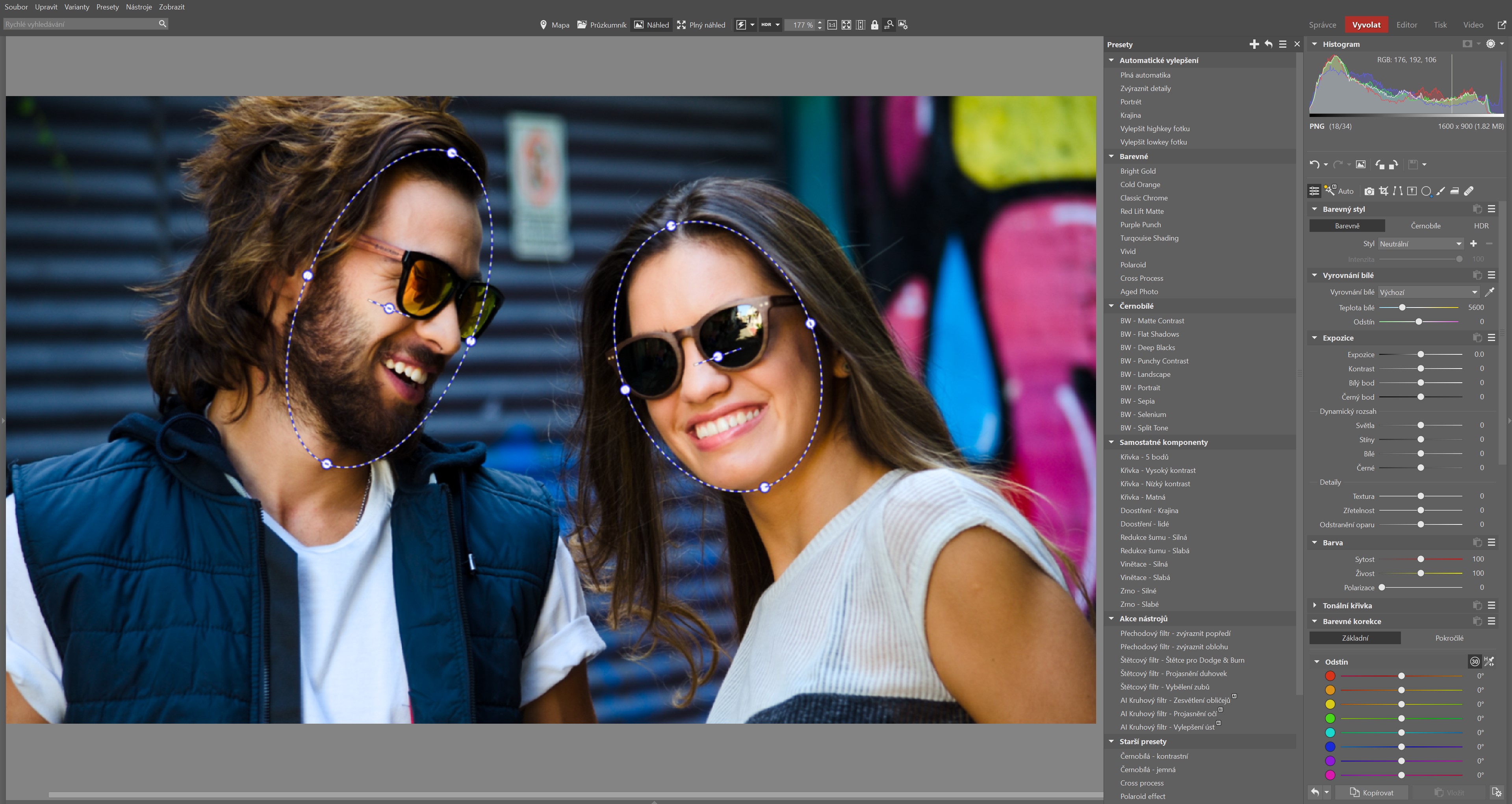 V module Vyvolať rozpozná umelá inteligencia tvár, oči a pery na fotke a navrhne ich vylepšenie pomocou kruhových filtrov. Výsledkom je jemné rozjasnenie tvárí a zvýraznenie detailov pre prirodzený vzhľad. Mieru týchto úprav má fotograf samozrejme stále pod kontrolou.