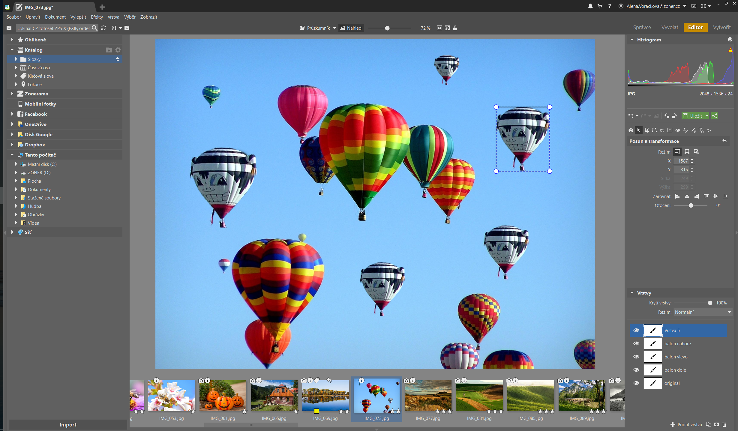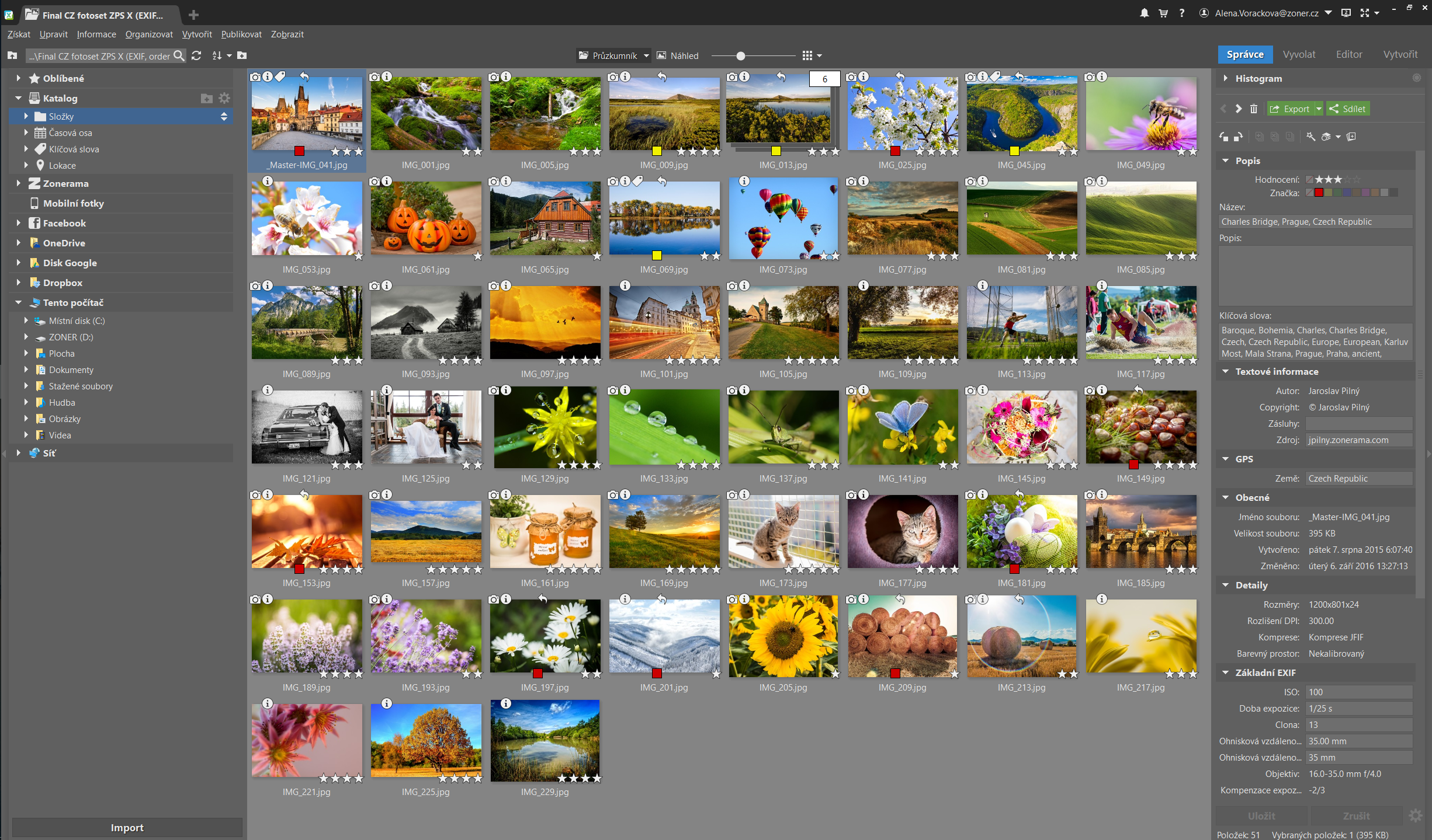 Snímky s podobným obsahom, určené na vytvorenie panorám alebo HDR, môžete zlúčiť do skupiny, aby nezaberali priveľa miesta, fotky sú však stále prístupné samostatne, iba v katalógu sa zobrazia ako skupina. Zoner Photo Studio X integruje aj cloudové úložisko, takže sa rýchlejšie dostanete k svojim fotkám na úložiskách Google Disk, Microsoft OneDrive, Dropbox a na Facebooku.