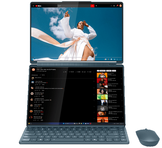 Dizajn s dvoma obrazovkami otvára jedinečné možnosti použitia. Jednu obrazovku môžete používať ako plátno, zatiaľ čo druhý displej funguje ako skicár alebo priestor na spustenie softvéru na generovanie obrázkov umelej inteligencie. Tie sa potom dajú rýchlo a jednoducho pretiahnuť na plátno. Dvojitý displej tiež zvyšuje produktivitu a komunikáciu - na jednej obrazovke môžete viesť videohovor a druhú obrazovku použite ako poznámkový blok alebo priestor na okamžité úpravy umeleckých diel. Použite priloženú klávesnicu Bluetooth, klávesnicu na obrazovke, stylus Yoga Pen alebo priložený špeciálny kryt Folio, ktorý slúži ako stojan, pre neobmedzené spôsoby tvorby.