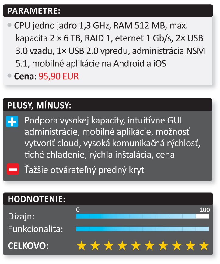 Na ovládanie bez PC môže majiteľ použiť mobilnú aplikáciu ZyXEL Drive. Na jej využitie potrebujete účet myZyXELcloud, ale je podporované aj prihlásenie pomocou sociálnych sietí. Túto aplikáciu môžu využívať aj ďalšie osoby, ktoré od vás dostanú povolenie na prístup k údajom, ako napr. členovia rodiny, priatelia či kolegovia. Takto vytvoríte vlastný osobný cloud. Mobilná aplikácia ZyXEL zCloud poslúži na streamovanie obsahu zariadenia na veľké obrazovky pomocou zariadení, ako je napr. Apple TV, Google Chromecast či televízory od LG a Samsungu s funkciami smart. Páči sa nám, že aktívne chladenie s premenlivými otáčkami ventilátora je pri minimálnej záťaži veľmi tiché.