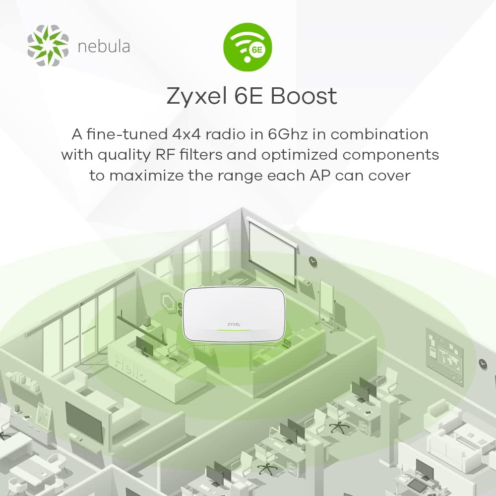 V novom pásme 6 GHz, ktoré netrpí vzájomným rušením kanálov, takže v porovnaní s 5 GHz poskytuje viac než dvojnásobnú priepustnosť, samozrejme, fungujú všetky technológie známe z Wi-Fi 6, teda OFDMA, MU-MIMO a BSS Coloring. Zyxel WAX640S-6E disponuje anténnym systémom 4×4 v pásme 6 GHz, 2×2 v pásme 5 GHz a 2×2 v pásme 2,4 GHz. Streamy 4×4 v pásme 6 GHz pomáhajú zvyšovať maximálny zisk pri využití technológií Transmit Beamforming a MIMO. Teoreticky dosiahnuteľná prenosová rýchlosť je až 7,8 Gb/s. Trojpásmový prístupový bod bol veľkou výzvou aj pre konštruktérov. Kanál s najvyššou frekvenciou v pásme 5 GHz pre EÚ má 5,725 GHz a kanál s najnižšou frekvenciou v pásme 6 GHz má 5,925 GHz, čo je rozdiel len 200 MHz. V pásmach pre USA je to dokonca len 50 MHz, preto bolo treba navrhnúť sofistikovaný RF filter, ktorý zabraňuje vzájomnému rušeniu a zaručuje spoľahlivý výkon vo všetkých kanáloch a v oboch pásmach súčasne. Prístupový bod WAX640S-6E môžete konfigurovať nielen pre pásma 2,4 GHz a 5 GHz, ale je pripravený na budúce využitie v pásme 6 GHz.