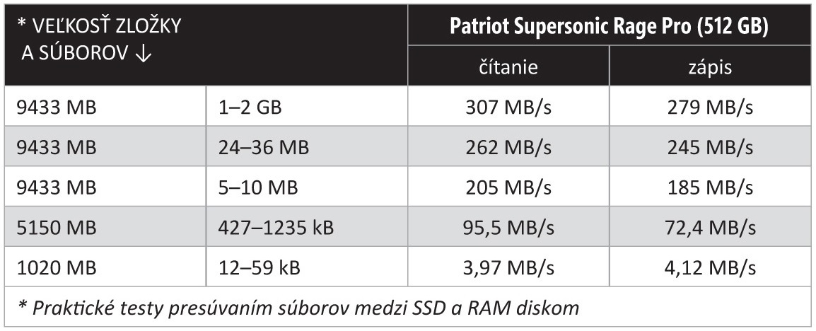 Preto sa na jednoduché kancelárske účely, sprevádzané typicky prenosmi malých dokumentov, príliš nehodí, respektíve nemá zmysel si zaň priplácať. Na prácu s fotkami, videom či grafickými súbormi však môžeme Supersonic Rage Pro odporúčať. Oproti modelu Fang má síce pomalšie čítanie, ale zase si drží stabilne vysoký výkon sekvenčného zápisu.